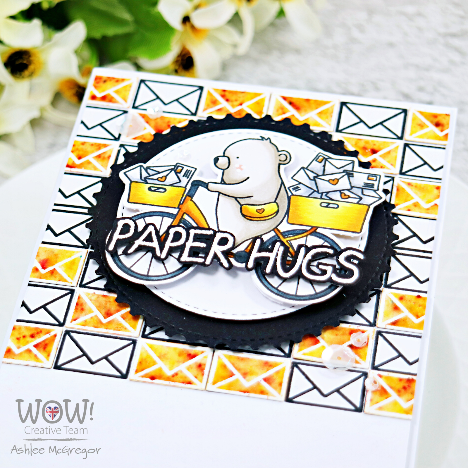To finish the card off I heat embossed the Paper hugs sentiment using WOW! Opaque bright white powder on some black cardstock and fussy cut it out, a touch of sequins and it was all complete!!